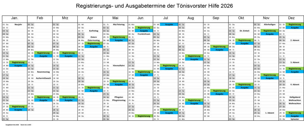 Die Lebensmittelausgabe findet alle 14 Tage mittwochs ab 11:30 Uhr statt. Die genauen Termine (farblich grün unterlegt) können dem unten stehenden Kalender entnommen werden (direkter Download).